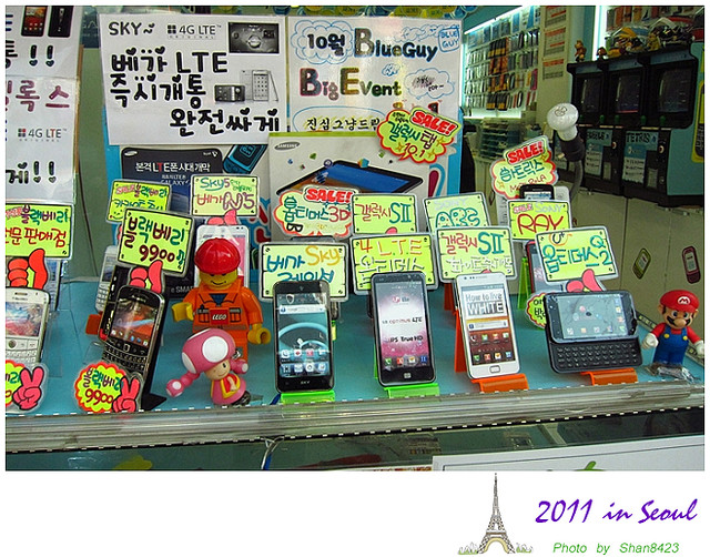 手機店:韓國店家都是把模型手機擺在外面,還有一堆看不懂的韓語。