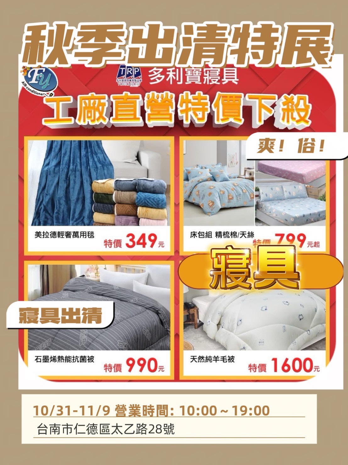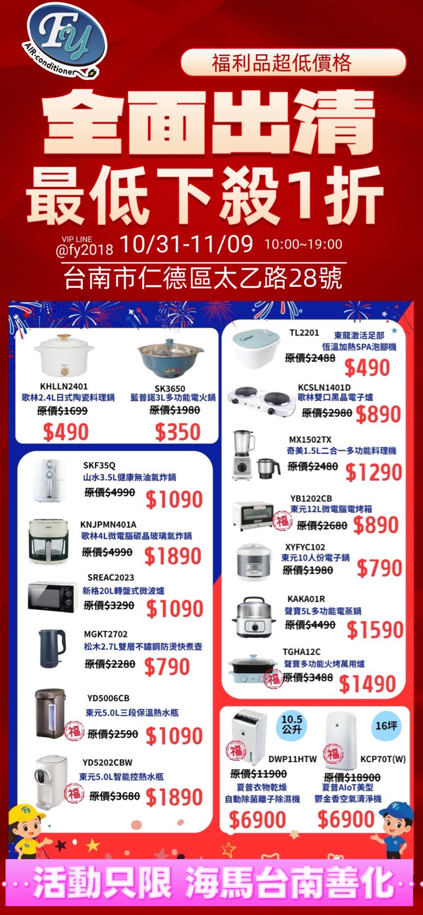 【台南特賣】仁德 FY家電特賣會 (10/31-11/9) 挑戰全台最低價~ 韓國鍋具.行李箱.床墊.寢具.鞋款聯合特賣!