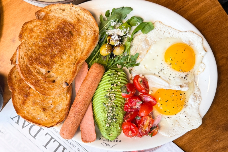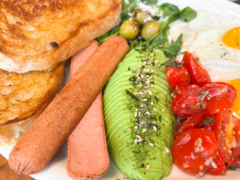 滿滿的酪梨搭配雙太陽蛋、素火腿和兩片烤土司,營養滿分!
