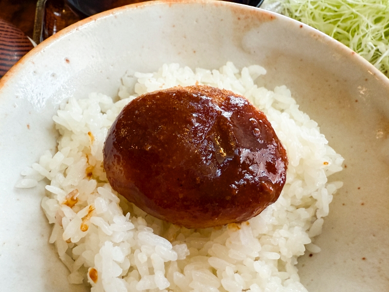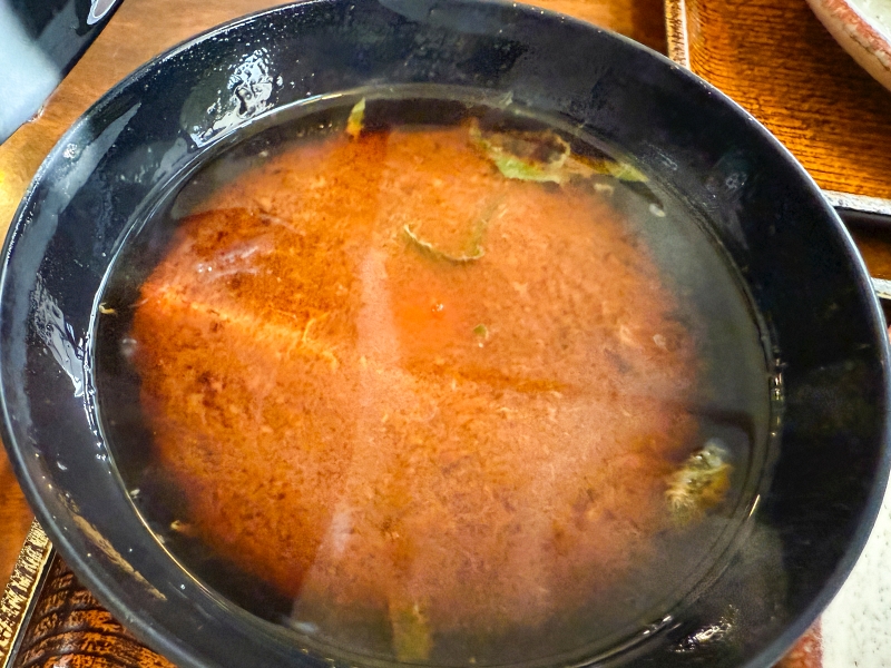 味噌豬排是圓肉餅狀,附餐有味噌湯和一盤醃菜。
