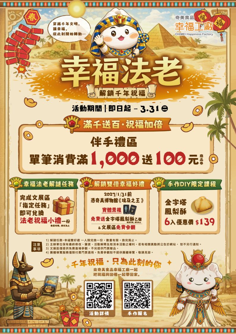 即日起至 2027/1/31 止,憑《埃及之王:法老》展覽實體票根,即可至服務台兌換:專屬金字塔鳳梨酥乙個及文展區免費參觀一次