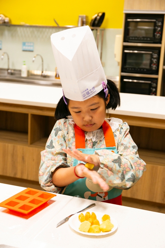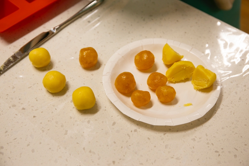 親子同心協力把鳳梨酥皮和鳳梨餡切分、搓圓~