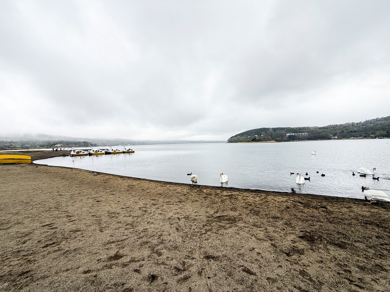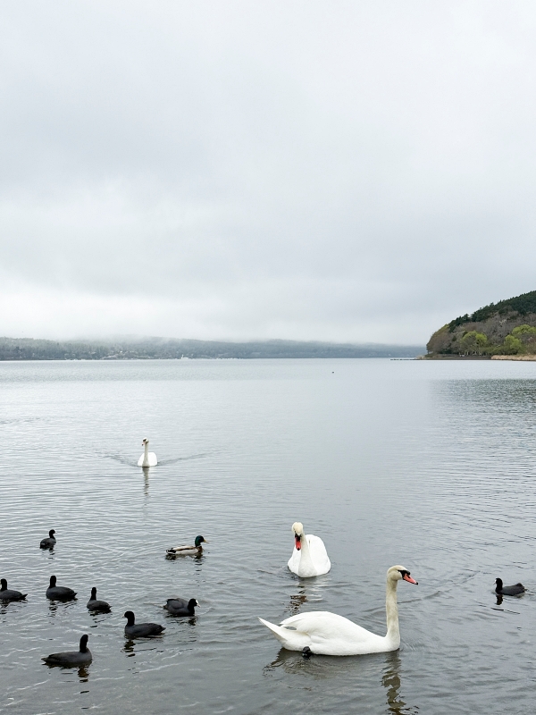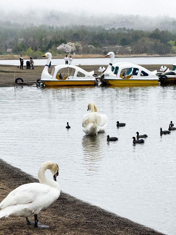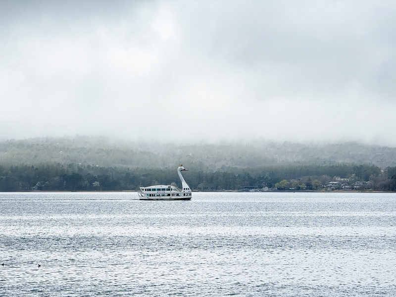 拍到濛霧中的山中湖遊覽船~~ 天鵝湖!