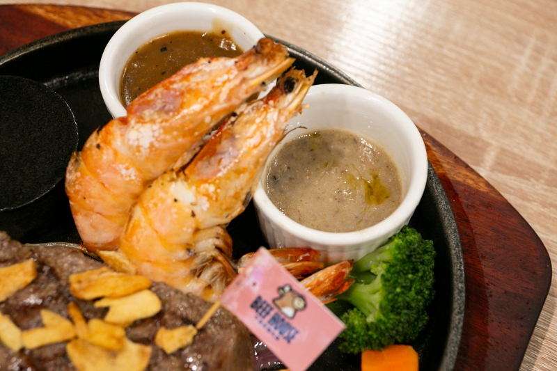 頂級菲力牛排570元,99元加購兩隻火烤大白蝦,